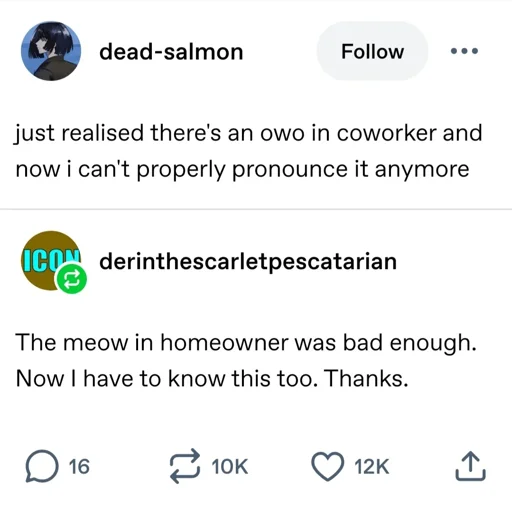 minus-squareCaptain Packrat@pawb.sociallinkfedilinkEnglisharrow-up4·10 days agoI always see it as cow-orkers